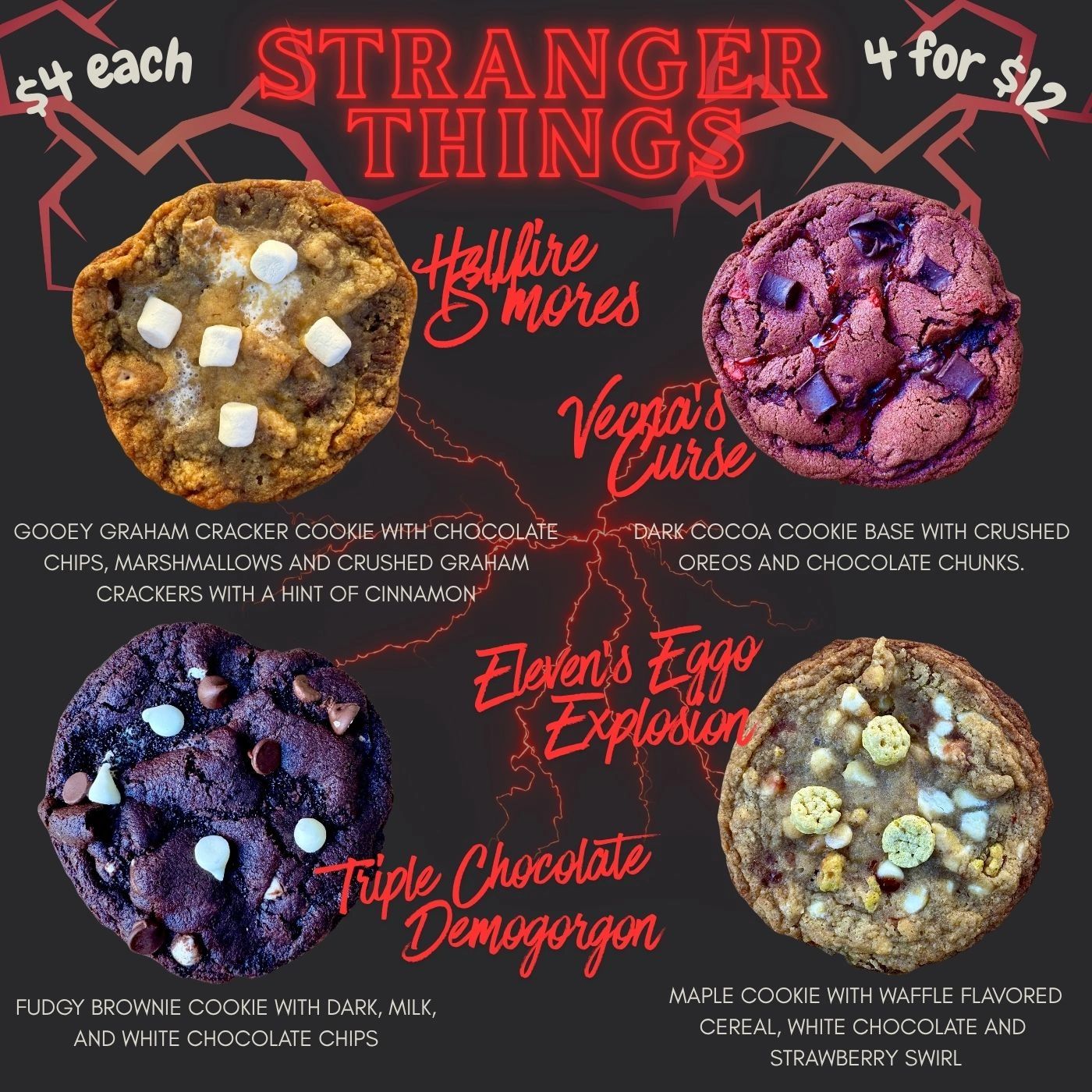 Have you been counting down the days until Season 5?! Well, we have something for you while you wait! Try ALL FOUR of our NEW Stranger Things inspired cookies. These aren't your typical cookies - they are 4.5oz and delicious!